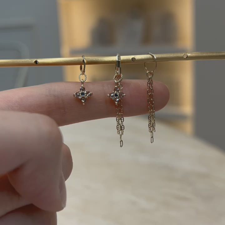 By draping the “Dido Chain” on the helix, connecting it to the choice of your studs on your Conch piercing, creates a sleek, flowing design that adds a modern edge the overall look.