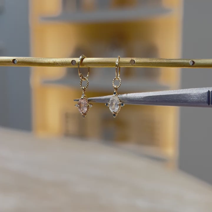 Play around with the magical allure of Grey Moonstone & London Blue Topaz studs along your Conch piercing, complemented by a each matching stone drop charm and hoop.