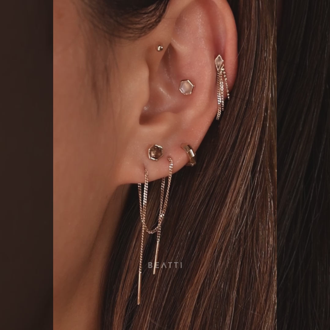 Introducing our Diamond Facet Micro Huggies, meticulously crafted in 14k solid gold. This 5mm huggie hoop showcases a brilliant faceted diamond-cut design, reflecting light with every movement to create a dazzling display of sparkle. Perfect for thinner piercing locations like the helix, tragus, or third earlobe, these earrings combine a robust construction with a luxurious aesthetic, making them ideal for daily wear.