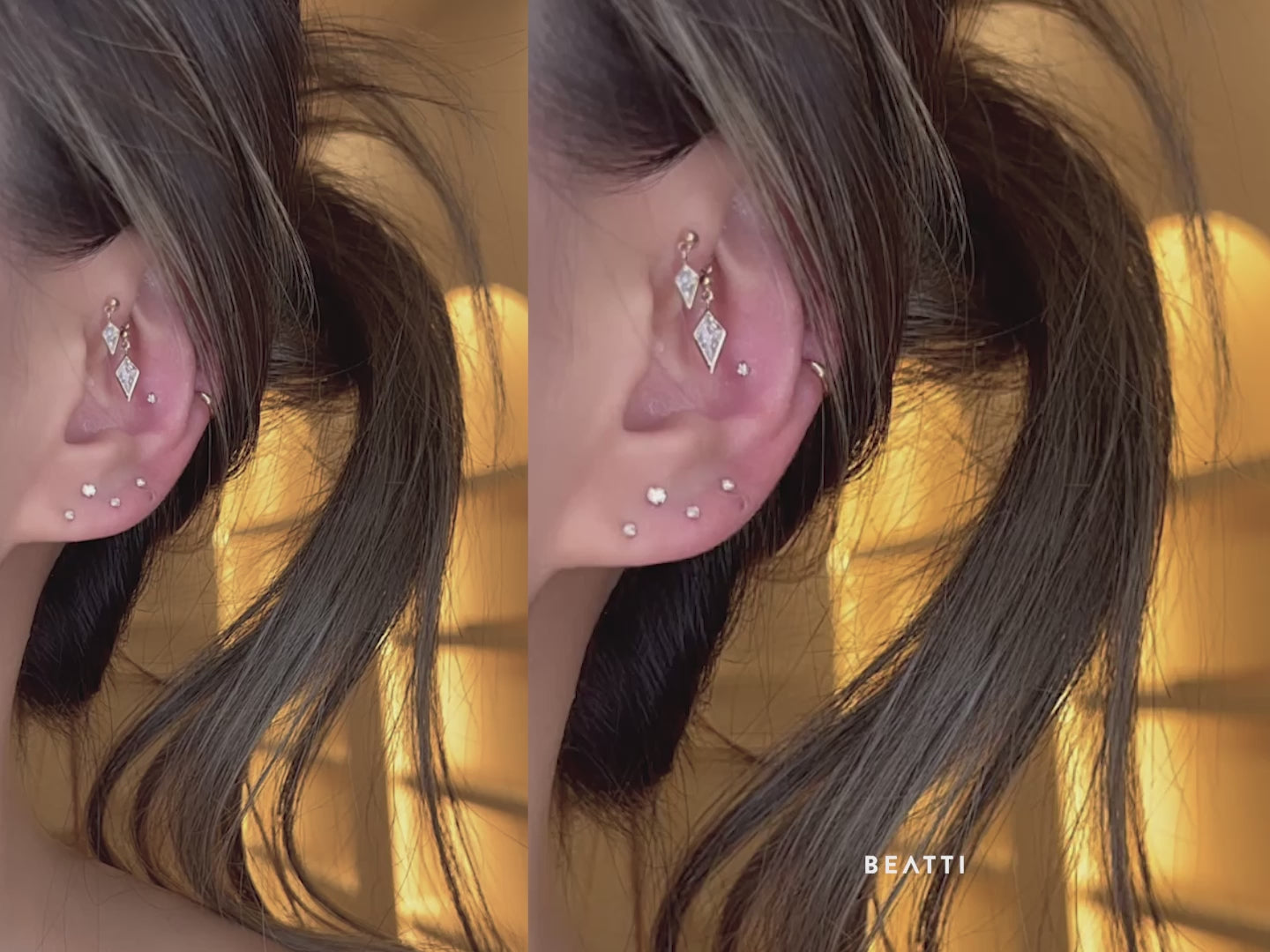 Our top-selling Riké piercing brings a bold yet refined look. Crafted in solid 14k gold, it features fine diamond dangles front and back, designed to move with subtle sparkle. A standout choice for forward helix or lobe piercings, blending edge with elegance.