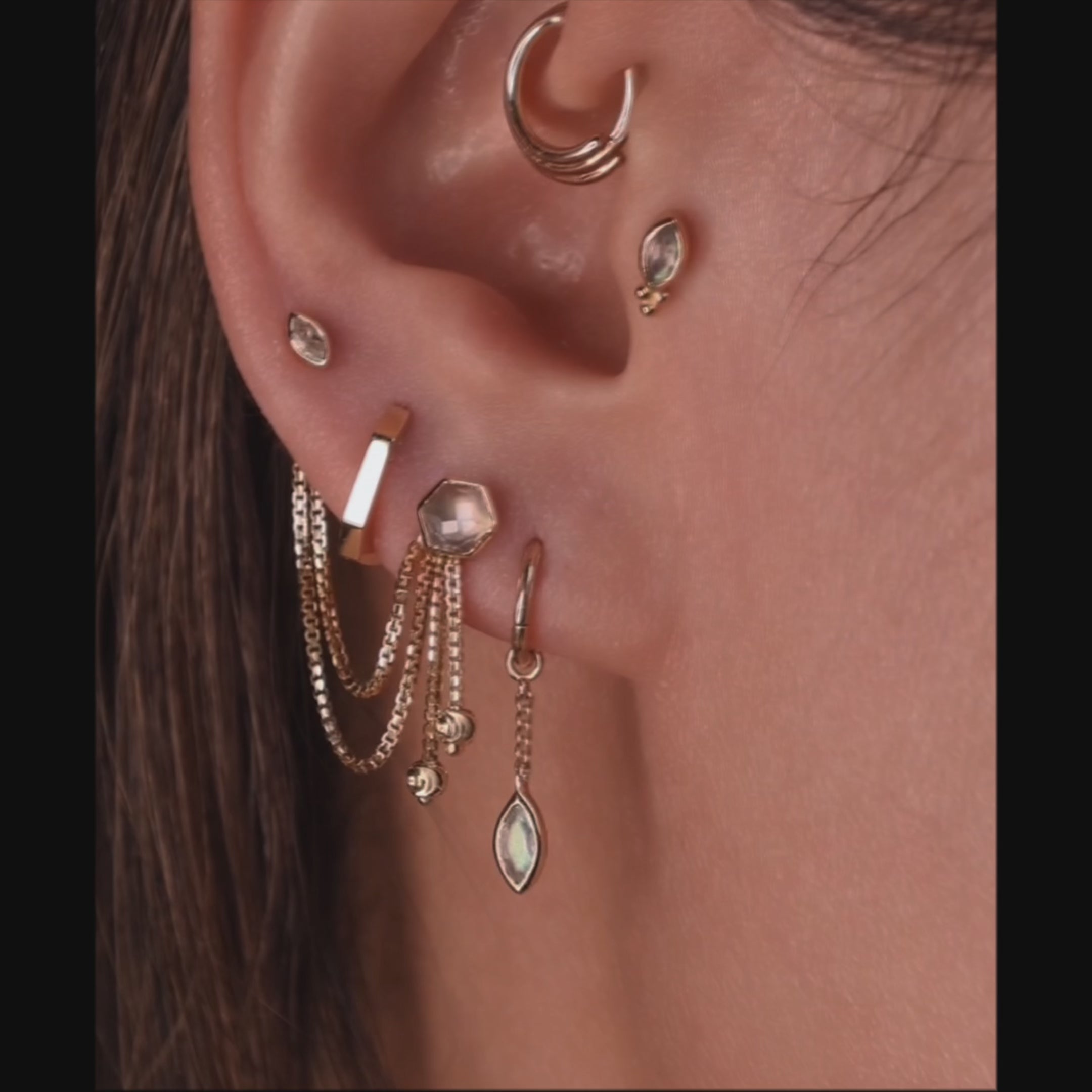 Perfect as a statement piece for conch, helix, or earlobe piercing, this stud adds elegance to any look effortlessly. Whether it's the subtle charm of the grey moonstone or the modern flair of the honeycomb design, Aria offers a unique and tasteful accent for those who appreciate fine details. This 14K gold creation is a timeless treasure, adding a sweet touch of luxury to your everyday style.