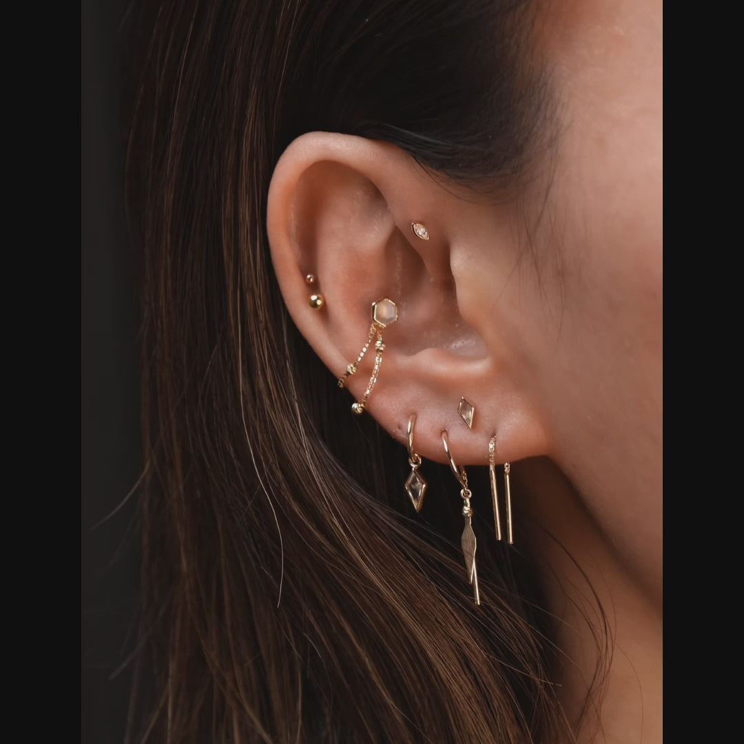 Enhance your look with our short chain threader, crafted from our signature brilliant-cut box chain. Designed for thinner earlobes or the helix area, this delicate piece measures a shorter length, perfect for those who prefer a subtler style. The thin bar pendulum elegantly swings with movement, adding a sophisticated touch of grace to any outfit.