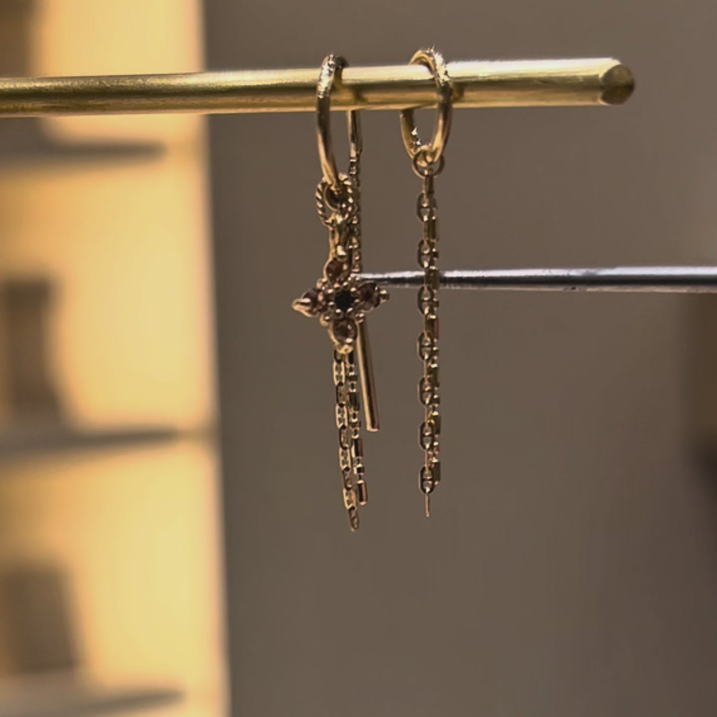 Two contrasting chains hang in clean parallel lines, creating a structured, minimal drop with soft shine and movement. Designed to pair with posts or hoops for a polished layered effect.