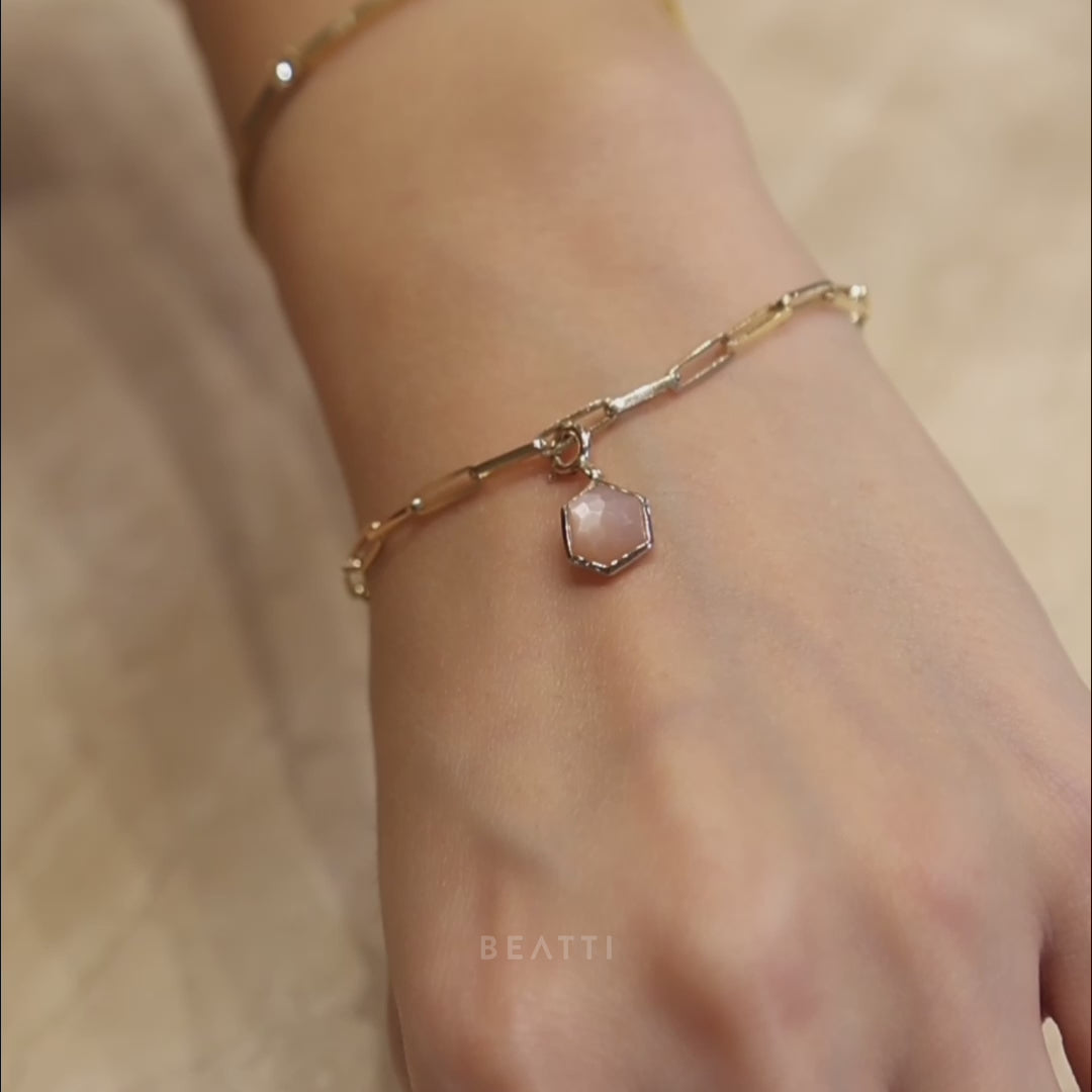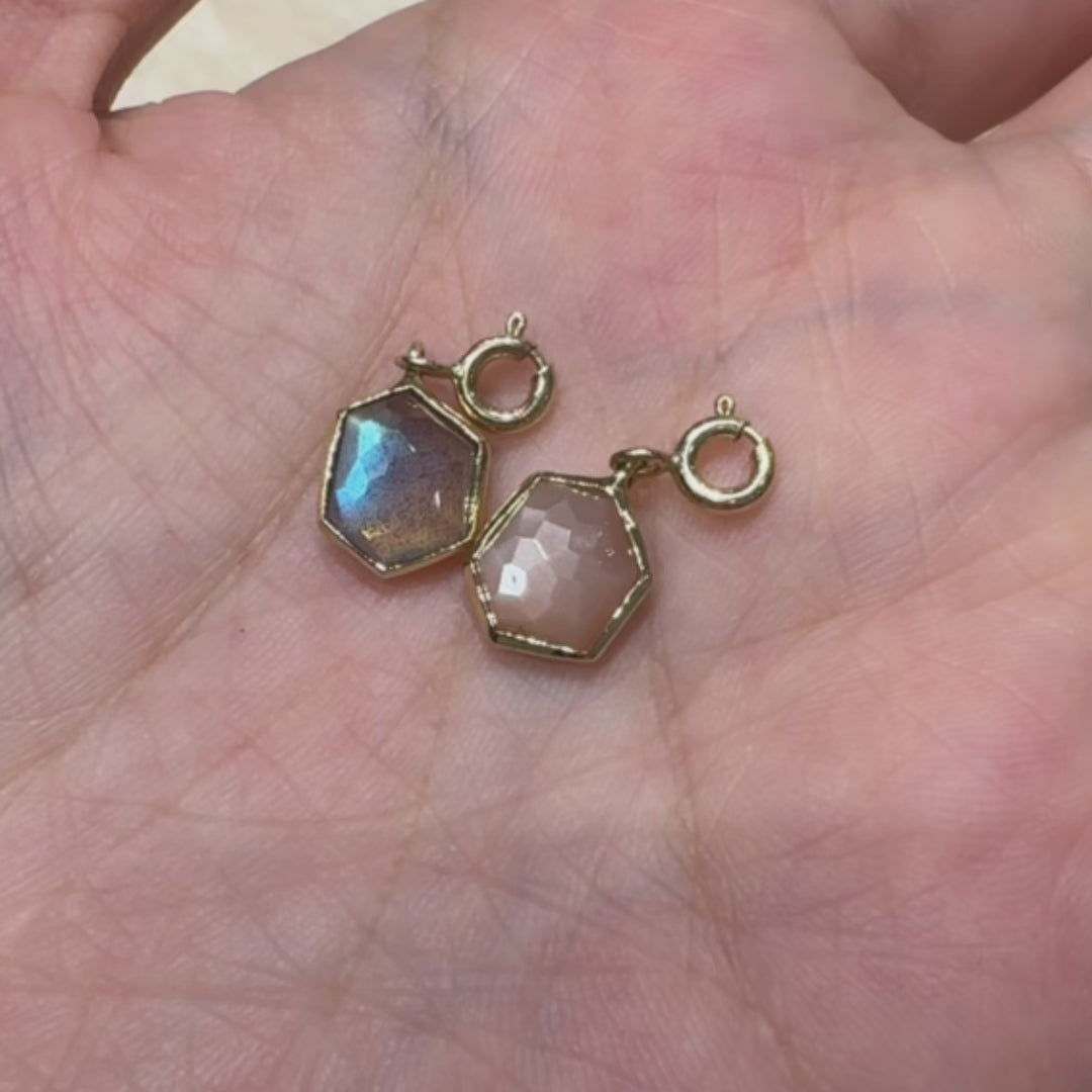 These stunning hexagon-shaped pendants feature our signature irregular dome cut, showcasing the unique shimmer and brilliance of each gemstone. The peach moonstone offers a soft, warm glow, while the labradorite captivates with its luminous, multi-dimensional flash.