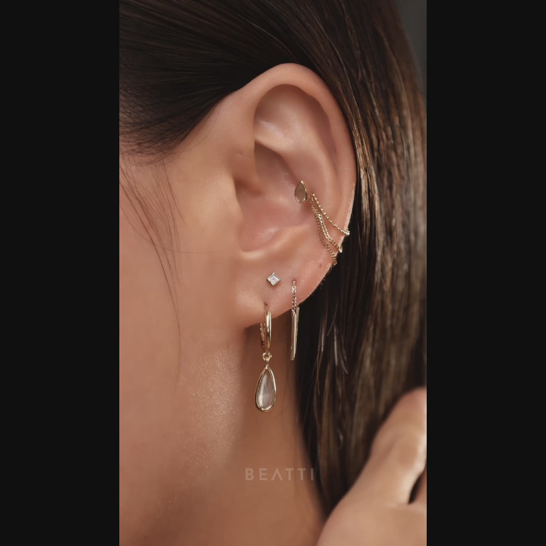 Introducing Iris: Our new hoop earrings featuring a briolette-cut Grey Moonstone in a durable bezel setting. The cut enhances the stone’s brilliance, while the simple design and dangling charm add a touch of sophistication to any look.