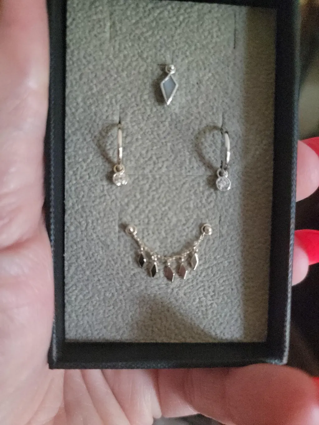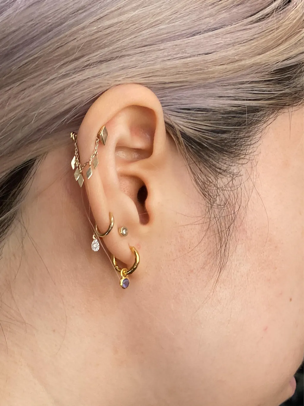 Enhance your ear jewelry with our gold chain attachment featuring five diamond rhombus shape plaque charms. Sparkling and flowing with your movement, these charms add a captivating accent to your curated ear piercings. Elevate your style with this exquisite and eye-catching piece.