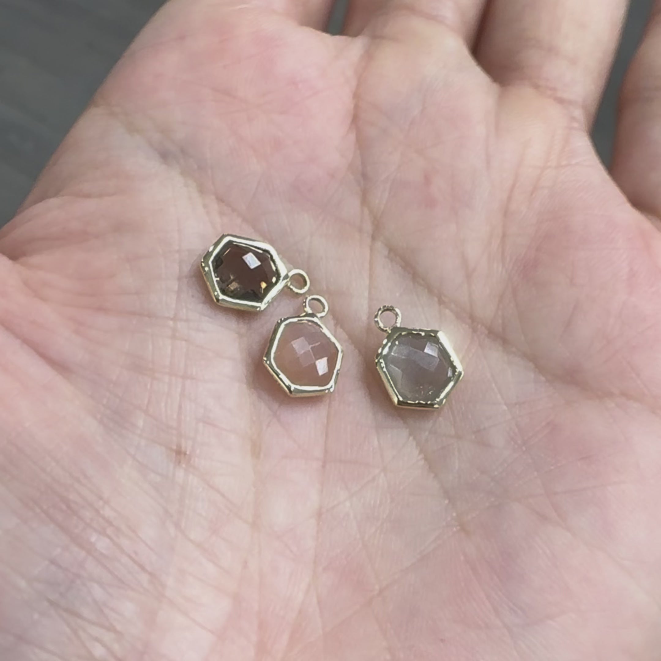 Introducing 'Rhea': a uniquely beautiful charm with a soft hexagon shape and checker-cut facets, designed to catch and reflect light, adding a rare and stunning element to your ear stack.
