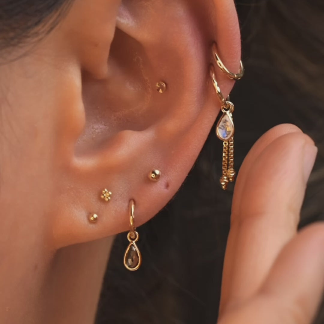 Introducing our newest addition, the Solara Charm. These elegant briolette cut teardrop gemstone charms are designed to enhance sparkle and light reflection, capturing attention with every turn. Their versatility shines through as they can be adorned on a post, hoop, or chain piercing, allowing you to customize your look to match your mood and style. The playful yet timeless design ensures that the Solara Charm never goes out of style, making it a perfect complement to any jewelry collection.
