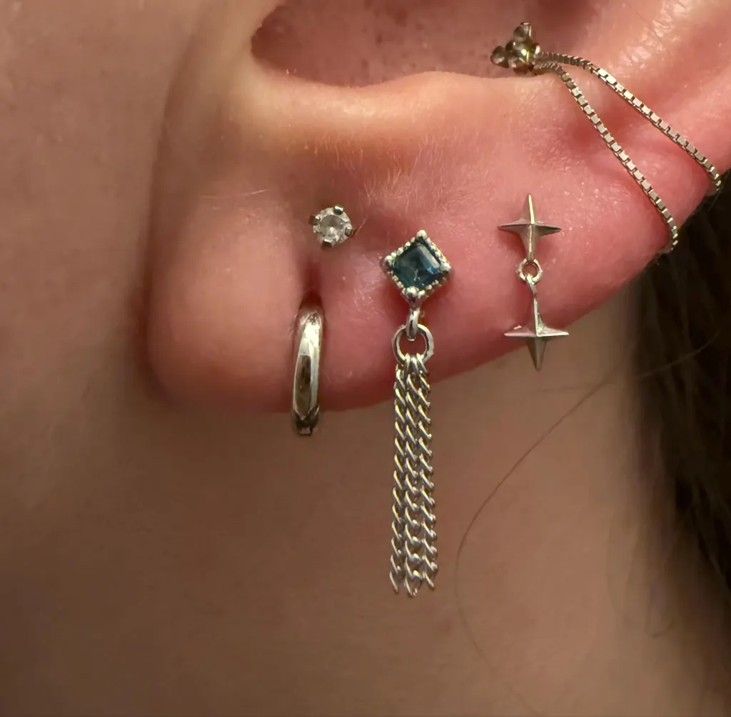 Tali brings a bold accent to any ear styling. A square-cut gem anchors the front, while fine chain tassels add shimmer and movement. Designed with a threadless push-pin and titanium post for a secure, flat-back fit. For healed piercings only.