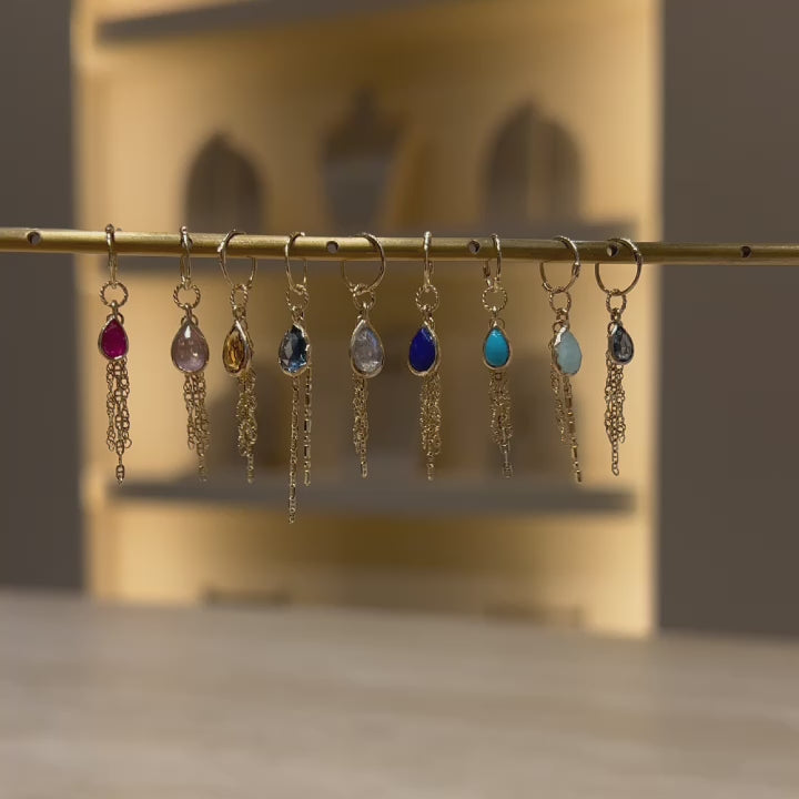 A sleek charm that brings soft movement and vivid detail to your ear curation. Set with a teardrop-cut gemstone in gold and finished with cascading chains, this piece comes in a perfectly wearable size that’s both subtle and eye-catching. A vibrant pop of color that elevates any look.